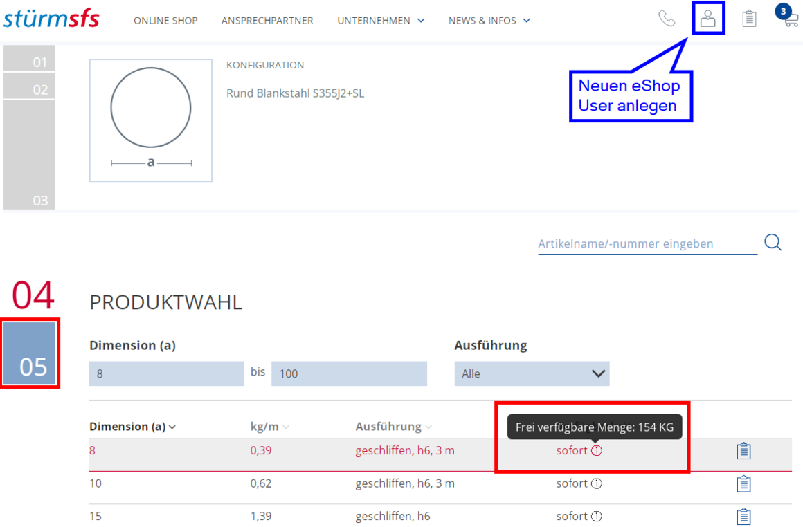 Neu wird, für angemeldete eShop Nutzer, auf Stufe Produktwahl bei der Fahrt mit dem Mauszeiger über das ⓘ Symbol der aktuelle Lagerbestand angezeigt.
