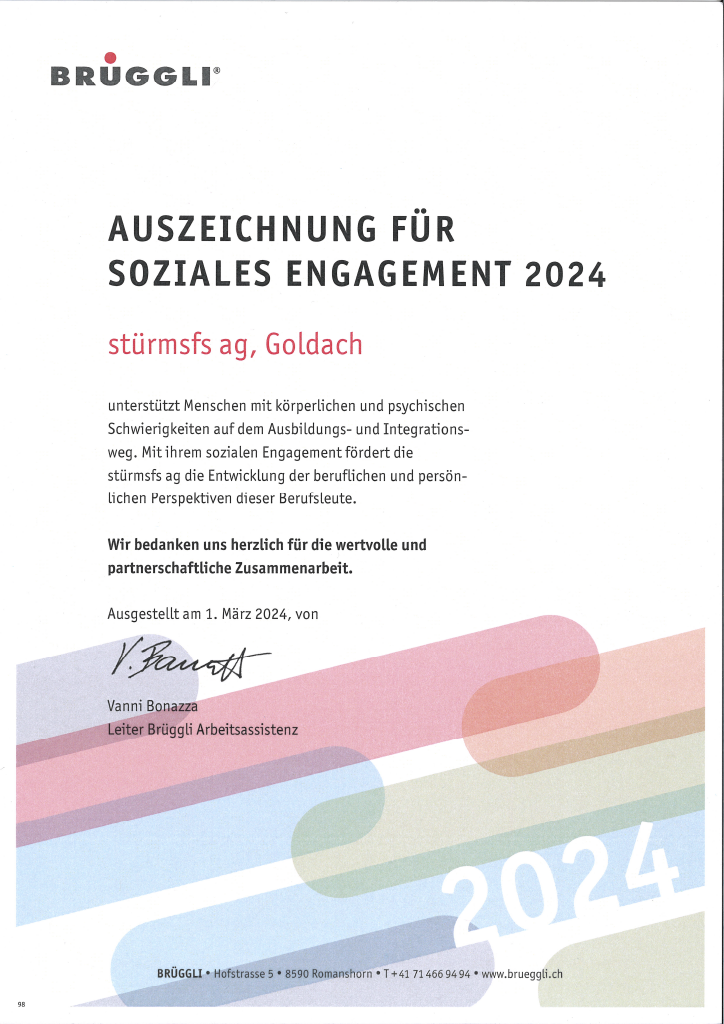 Die Partnerschaft zwischen stürmsfs und Brüggli ermöglicht eine praxisnahe Ausbildung und eine gezielte Vorbereitung auf den Arbeitsmarkt. Das bildet für die Teilnehmerinnen und Teilnehmer die Basis, selbstbestimmt und kompetent ins Berufsleben zu starten - bereit, im Betrieb wichtige Aufgaben zu übernehmen.