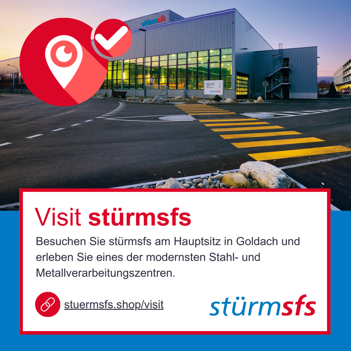 Gerne begrüssen wir Sie und Ihre Kollegen am stürmsfs Hauptsitz in 9403 Goldach. Erleben Sie hier eines der modernsten Stahl- und Metallverarbeitungszentren. Wir führen Sie fachkundig und mit viel Know-How durch unsere heiligen Hallen.