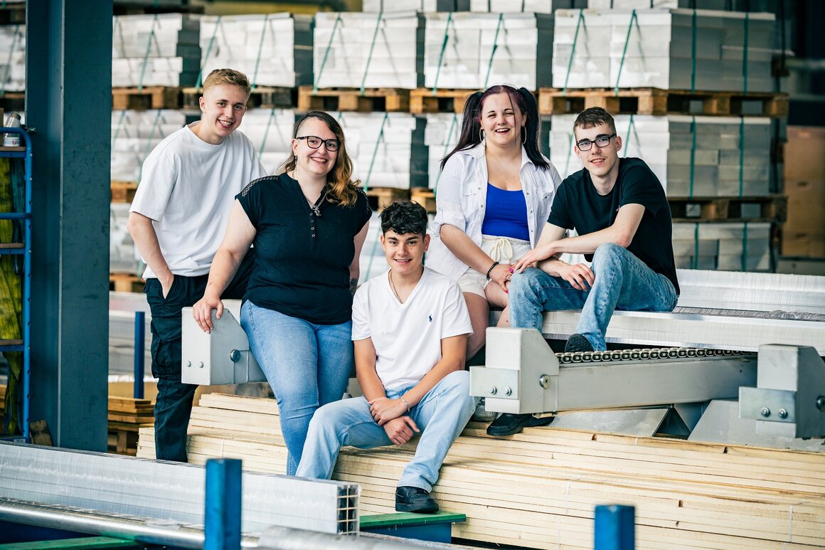 v.l.n.r. Fabio Beerle (Kaufmann E-Profil), Emmanuelle Neuhauser (Logistikerin EFZ), Stefan Stojkovic (Kaufmann M-Profil), Jasmin Baumgartinger (Logistikerin EFZ), Loreno Avanzini (Logistiker EBA)
